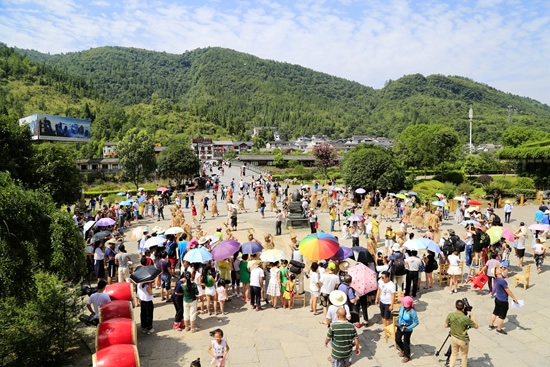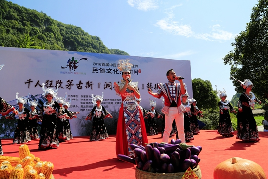 7月29日上午9點30分,由張家界市人民政府主辦,張家界市委宣傳部、市旅游和外事僑務(wù)委員會、市文體廣電新聞出版局、武陵源區(qū)人民政府承辦,黃龍洞景區(qū)協(xié)辦的“絕版張家界,最炫民族風(fēng)”張家界民俗活動月第三場活動在黃龍洞景區(qū)啟動,F(xiàn)場以土家人慶祝豐收的鼓舞拉開序幕,土家鼓舞歡悅的節(jié)奏,夸張的舞姿開場就吸引了幾千游人和當?shù)厝擞^看。草根夫妻檔歌手,張家界“山水組合許勇、舒維亮麗的服飾,野性的嗓音……”以一首《我在高山唱》歌曲,征服現(xiàn)場游客,贏得雷鳴般的叫好聲。