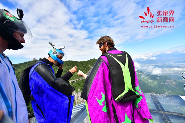 2017世界翼裝飛行世錦賽將于9月8日-10日在張家界天門山舉辦。開賽在即,9月7日上午,來自全球11個(gè)國家的16名翼裝飛行員從海撥1458米的張家界天門山玉壺峰頂一躍而下,在奇峰險(xiǎn)壑間進(jìn)行競速訓(xùn)練。